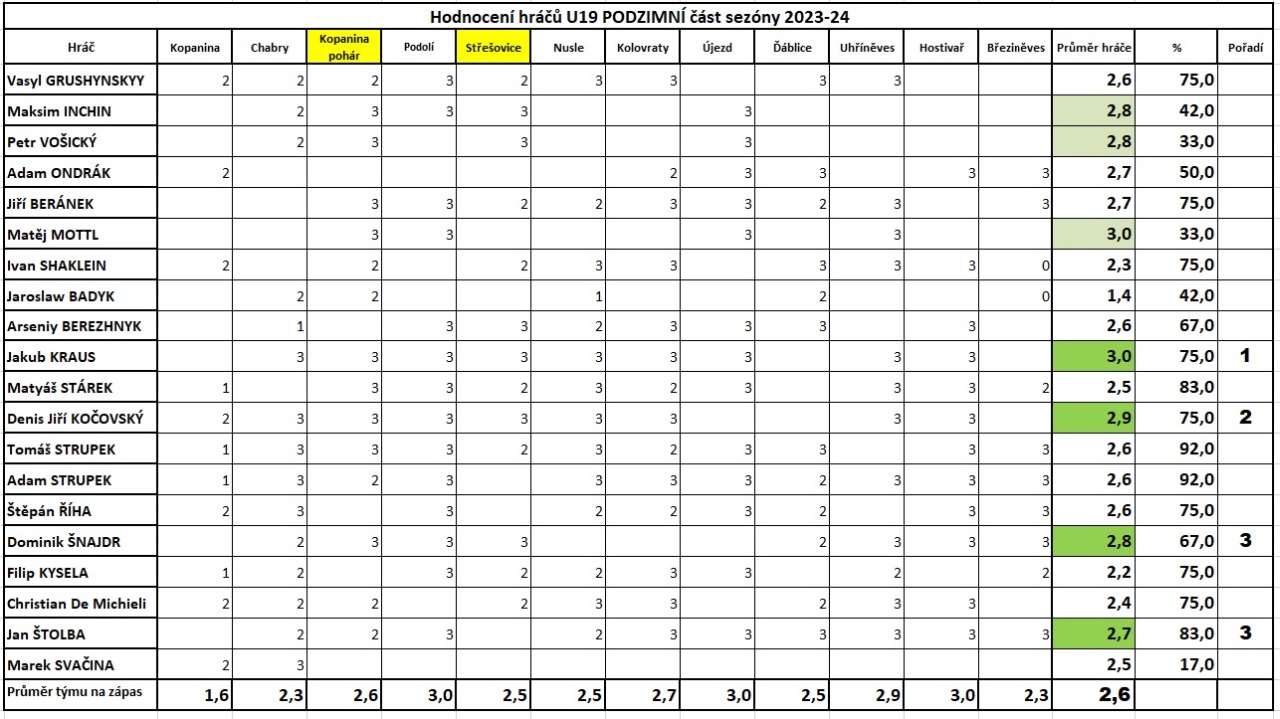 Pro možnost vyhodnotit nejužitečnějšího hráče, jsme zavedli bodové hodnocení všech nominovaných hráčů. Známkování je nejhorší "1", nejlepší "3". Známka je průměrem ze 3 ukazatelů a to za "chuť hrát, radost ze hry, nasazení při zápase". Vždy jsem ještě přihlížel na maxima, které jsou schopni hráči dosáhnout. S průměrnou známkou 3,0 se na prvním místě umístil náš univerzál Jakub K. Na paty mu šlapal Denis J.K. a na děleném 3 místě pak jsou dva hráči Dominik Š. a Honza Š. Celý tým pak dosáhl na průměrnou známku 2,6.