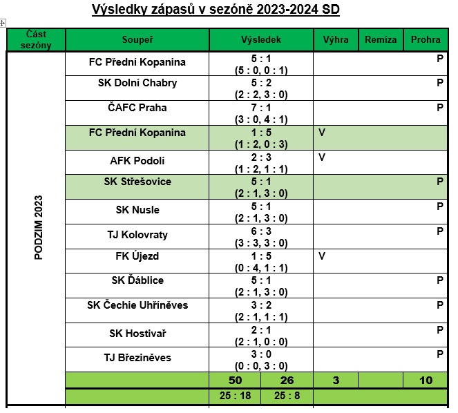 Ze shrnutí je vidět, že 10x jsme prohráli, 3x vyhráli. Celkové skóre je negativní, kdy jsme 26 gólů vsítili a 50 obdrželi. Z výsledků statistiky prvních a druhých poločasů, nám šly lépe ty první. Několikrát jsme si dokázali, že každá chybka je v této soutěži potrestána. Myslím, že jsme ještě ztratili pár zbytečných bodů, kdy jsme ztratili výborně rozehraný zápas v Kolovratech, který jsme si za výkon v celém zápasu zasloužili brát alespoň bod. Již zmíněné poslední 3 zápasy, kdy jsme také mohli nějaký bod urvat, ale štěstíčko se od nás trochu odklonilo :-( V zimě nás čeká hodně práce, ale věřím tomu, že se na jaře popereme o posun v tabulce a soutěž uhájíme. Souhlasíte? :-)
